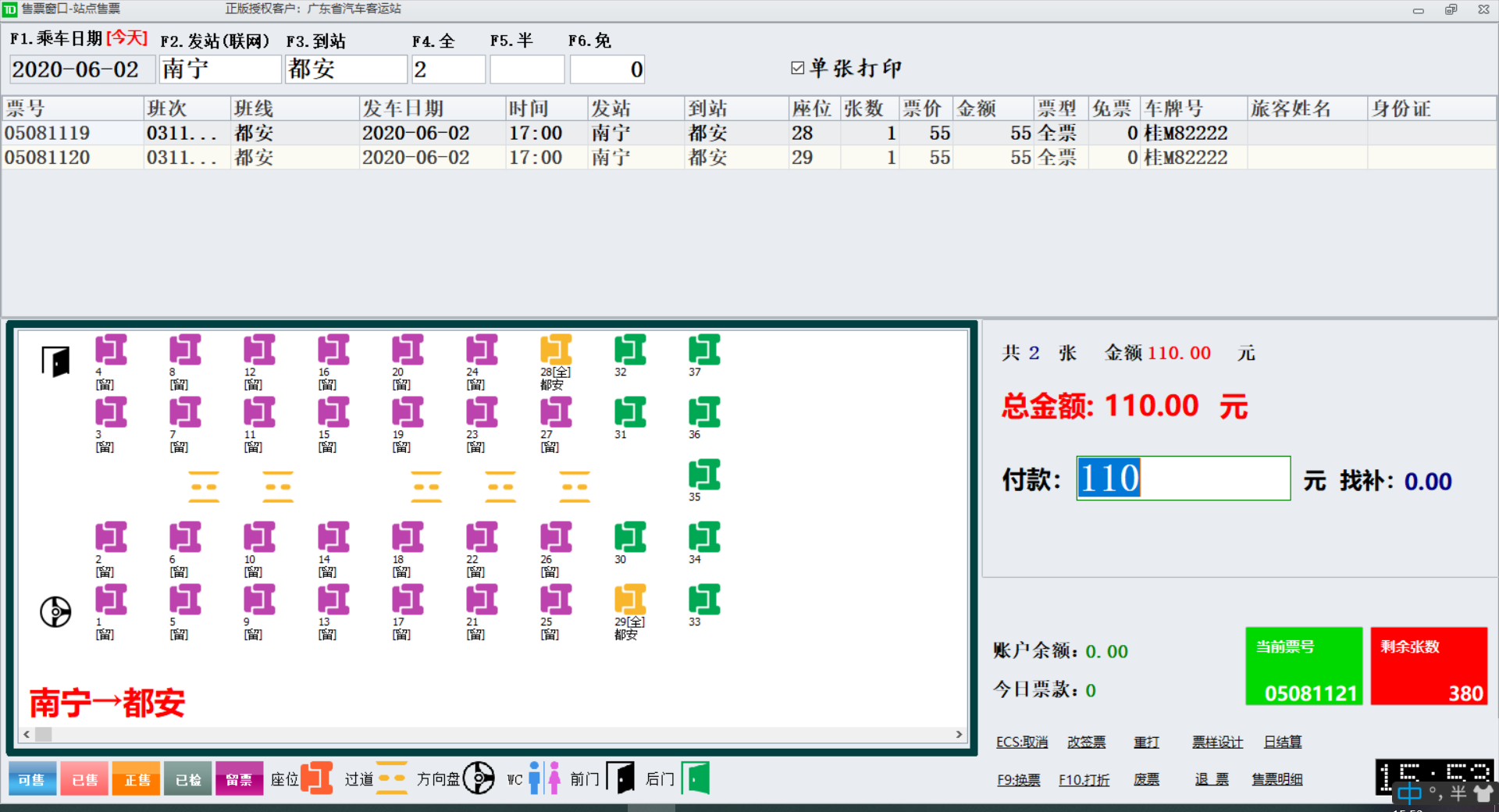 全键盘操作,出票快捷;支持单站、多站联网售票,支持结点售票;支持实名制售票;支持多种票价模式出售:折扣票, 预售优惠, 面议票价。支持售票窗口唱收唱付;支持现金、银联、支付宝、微信支付。