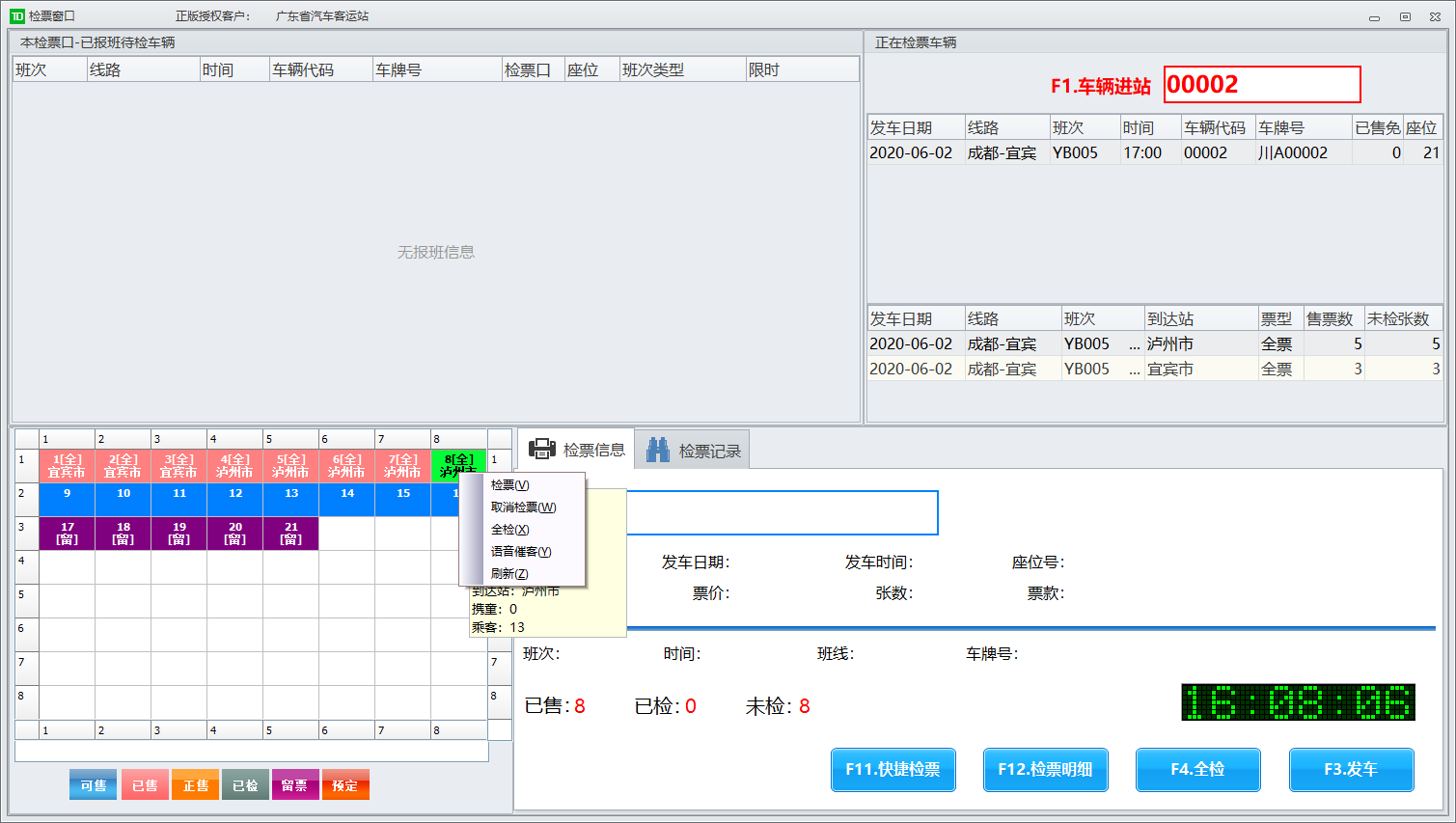 使用条码技术,快速检票,支持条形码自动 输入和手动输入票号、条形码检票,检票时 确定车票信息。支持混检,灵活应对班次多 种检票情况,系统独具座位催客功能,检票 员指定班次相关座位后系统会自动播音催客 完全与自动播音系统融合。